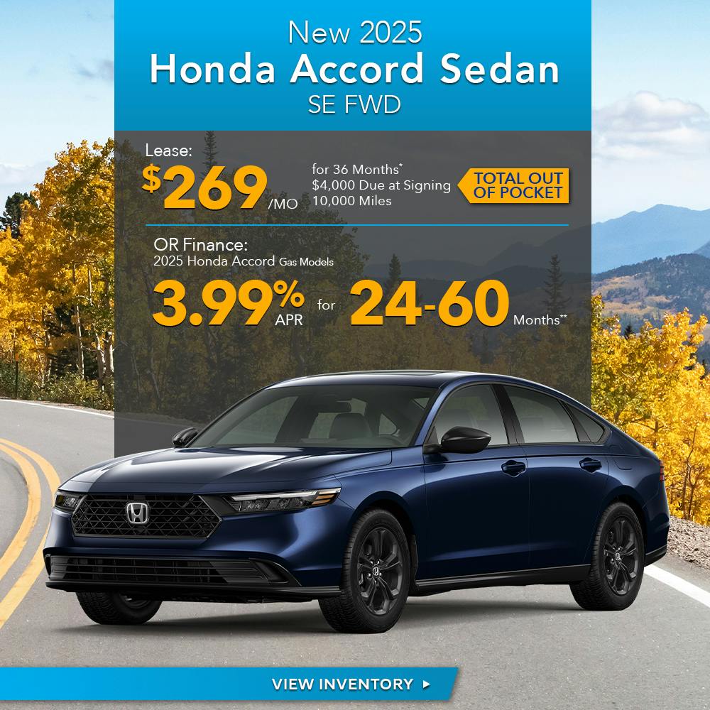 *2025 Honda Accord Sedan SE FWD. $269 plus tax for 36 months. $4,000 due at signing includes first monthly payment, tax, title, and license. $0 security deposit. 10,000 miles per year with 20ยข per excess mile. Dealer installed accessories will be extra. Customer responsible for maintenance. With approved credit. Stk# 650498. Vin# 1HGCY1F42SA051049. Selling Price $30,997. Offer includes $1,950 HFS lease cash HP-84S, and $2,000 HFS Loyalty or Conquest Offer HP-86S toward cap cost reduction and applies only to those who qualify. Model shown for illustration purposes only. Expires 11/3/25. **For well-qualified buyers. Example: 10% down payment. 60 months financing at $18.41/month per $1,000 financed. Available only for residents of AZ, CA, CO, CT, DE, FL, HI, IA, IN, KY, MA, ME, MI, MN, ND, NE, NH, NJ, NV, NY, OH, PA, RI, SD, UT, VT, WI. Available on approved credit through Honda Financial Services in select states only. 3.99% APR for up to 60 months on select new and unregistered 2025 Honda Accord Sedan models through 11/3/2025, for well-qualified buyers. Excludes Hybrid models. Not all buyers will qualify. Higher financing rates apply for buyers with lower credit ratings. Actual down payment may vary. Dealer participation may affect actual payment. Dealer sets actual prices. See participating dealers for details.